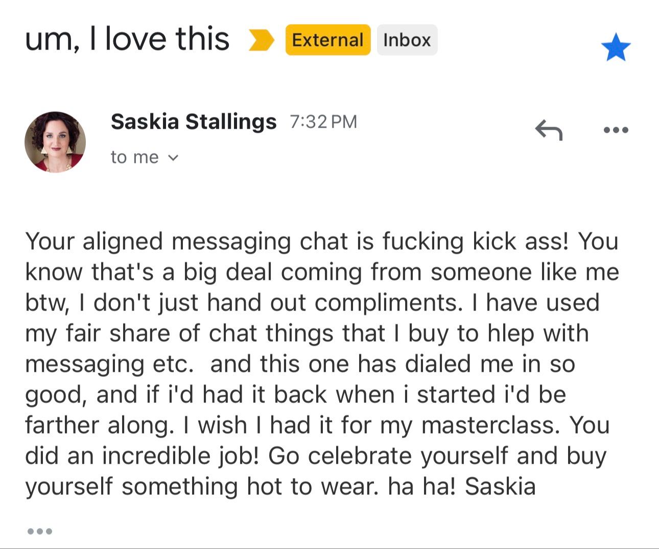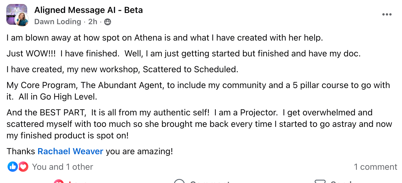 Athena is trained on my work, Human Design, and the patterns I use to recalibrate messaging in real time. She knows when you're playing small & calls you out (lovingly) and then realigns your message with your HD. And then she creates your messaging strategy based on your energy, not what worked for your coach.